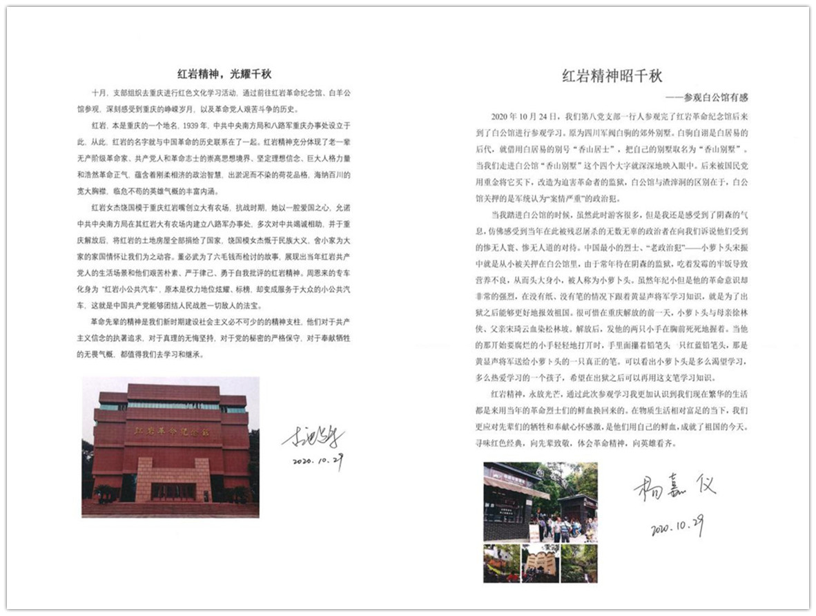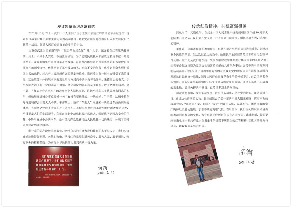 在這次的參觀學習過程中,我們共同緬懷革命先烈,共同回顧他們當年艱苦抗戰的故事,共同見識祖國逐漸強盛的發展歷程。未來,我們需要不斷傳承紅巖精神,堅守初心使命,為祖國建設奉獻出自己的力量。在本次行程結束后,幾位黨員就此次的參觀學習經歷撰寫了個人心得體會,在此分享: