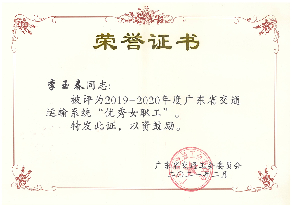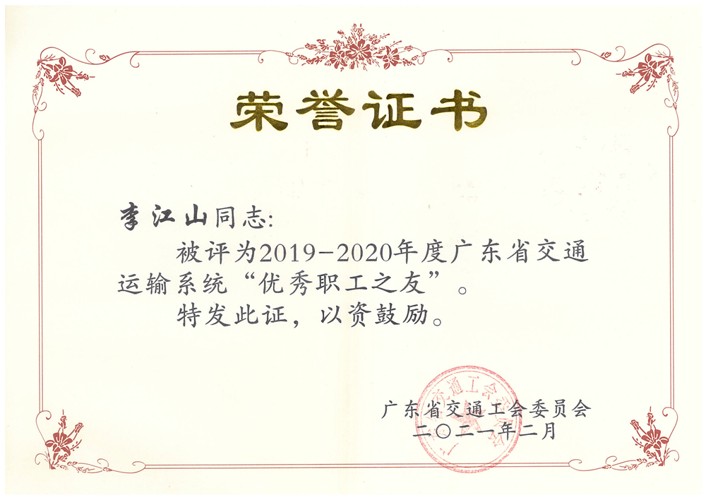 近日,公司工會被廣東省交通工會委員會授予2019-2020年度廣東省交通運輸系統“先進職工之家”榮譽稱號;公司董事長李江山同志被評為2019-2020年度廣東省交通運輸系統“優秀職工之友”,人力資源部主任李玉春同志被評為“優秀女職工”。