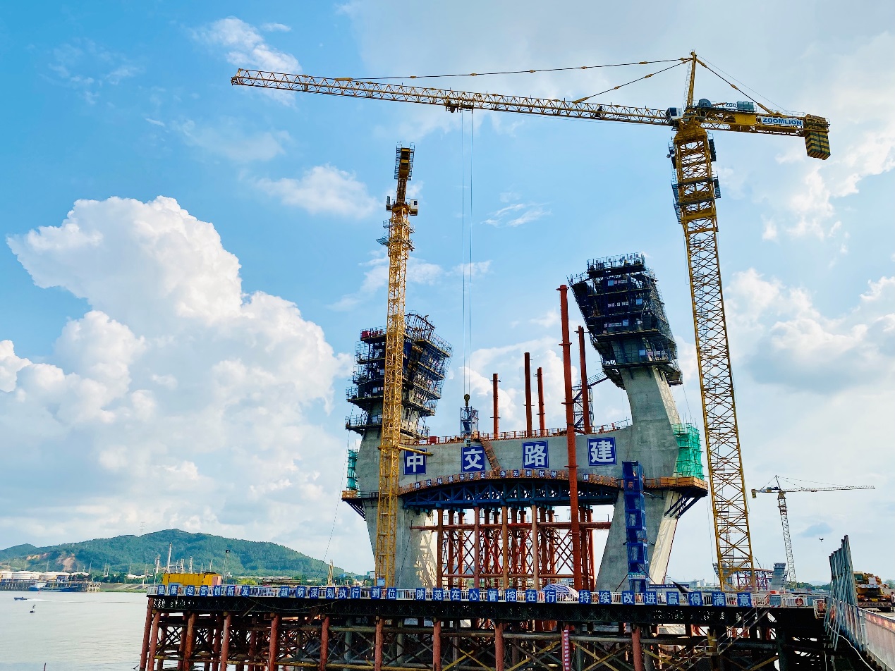 佛山市富龍西江特大橋工程建設總里程為5.81公里,總投資38.9億元,設計速度80公里/小時,采用一級公路標準兼顧城市道路功能,雙向8車道。該項目主橋采用主跨為580m的UHPC鋼混組合梁斜拉橋,目前正處于主塔中塔柱爬模施工當中,計劃2022年底建成通車。