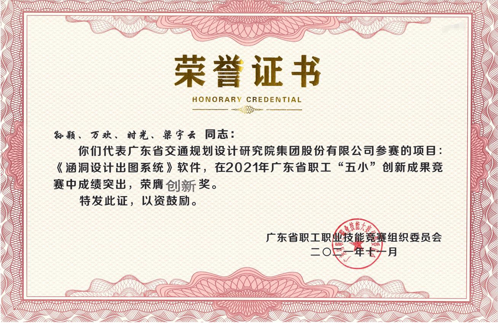 11月23—24日,2021年廣東省職工“五小”創新成果競賽決賽暨總結大會在廣州舉行。本次競賽由廣東省總工會、廣東省人力資源和社會保障廳、廣東省工業和信息化廳、廣東省科學技術廳主辦,廣東省總工會職工技術協作中心、廣東省質量協會、廣州市質量協會承辦。經過激烈的角逐,公司數字化技術研究院研發的《涵洞設計出圖系統》軟件榮獲創新獎。