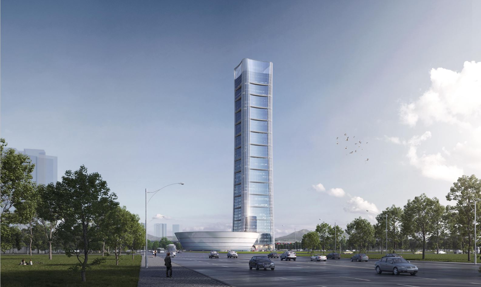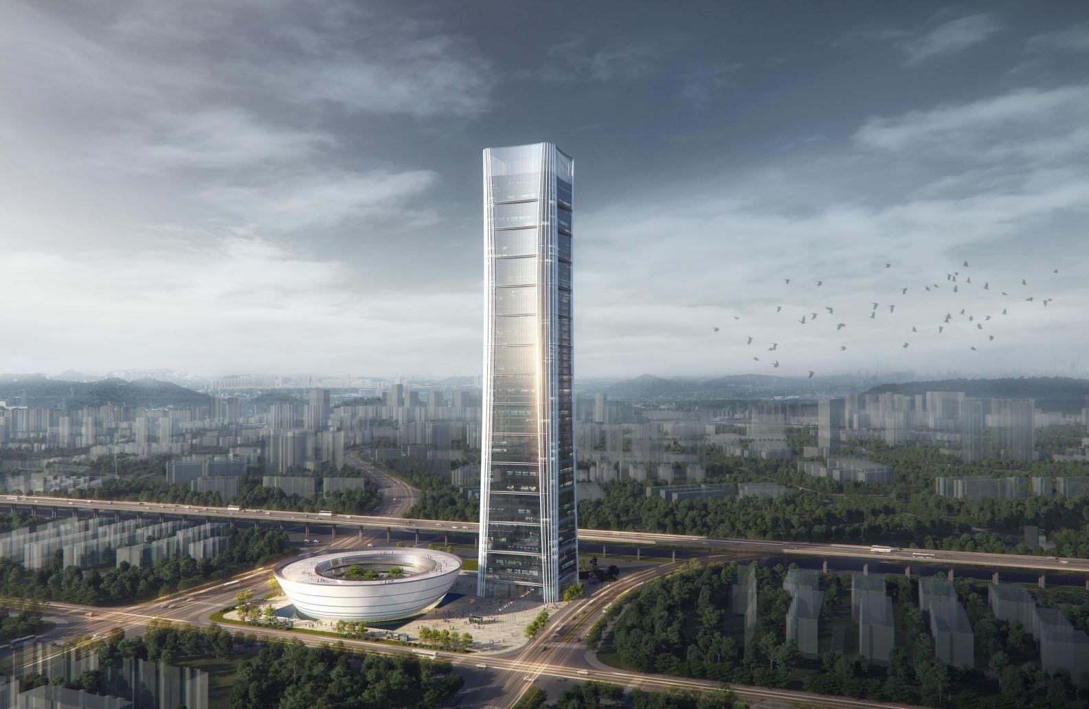 “灣區(qū)之源”方案以“天下萬物生于有,有生于無”為設計主題,由塔樓和裙樓兩部分組成,長短相形,高下相傾,前后相隨。塔樓功能以辦公和商住為主,外立面造型靈感來自竹節(jié),象征“生生不息,堅韌不拔”;裙樓平面布置可塑性強,可滿足會議、會展、商演等多功能需求,形似容器,通體渾圓,寓意“包容并蓄,有容乃大”。同時,方案圍繞“綠色、環(huán)保”進行了多項創(chuàng)新設計。