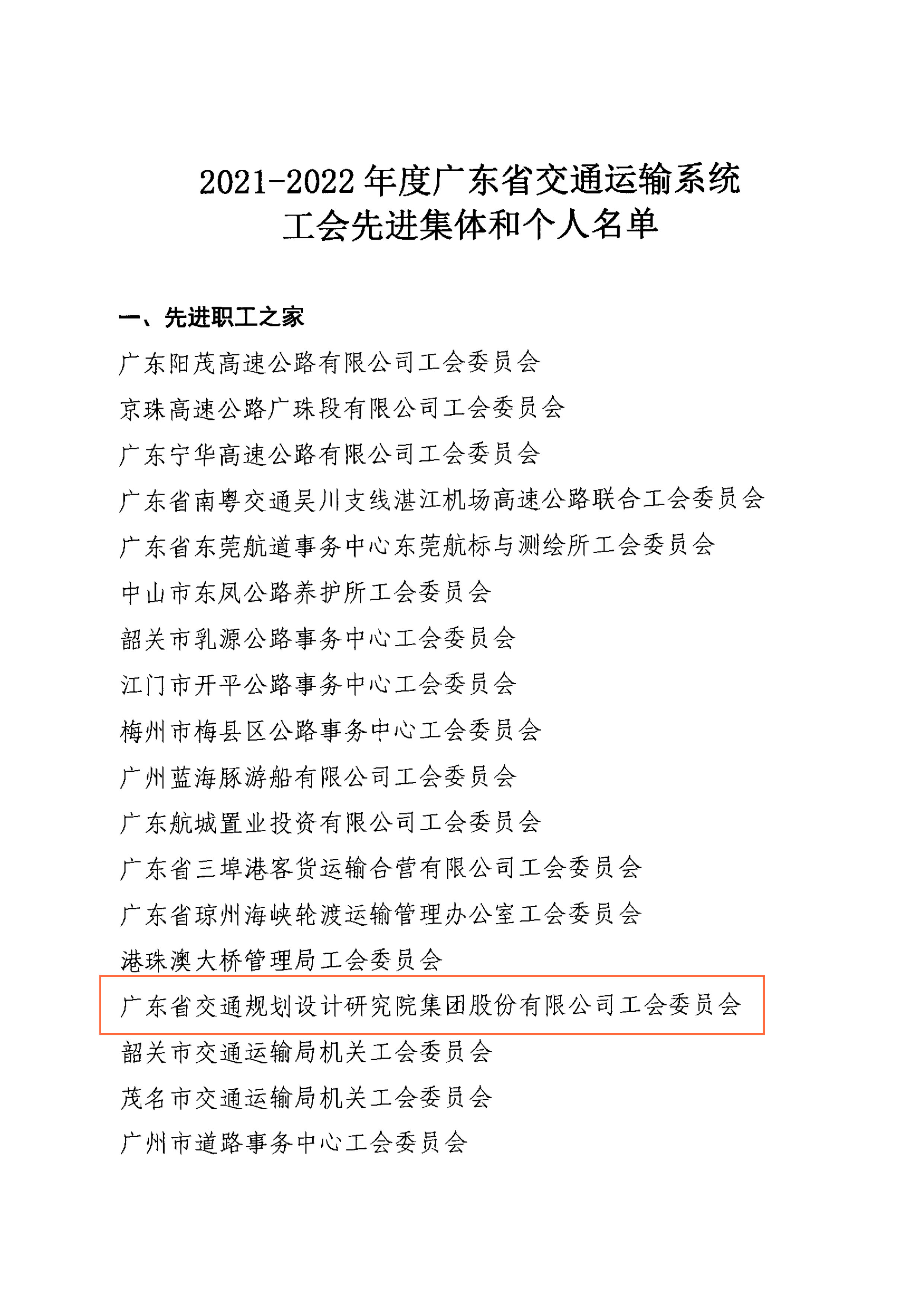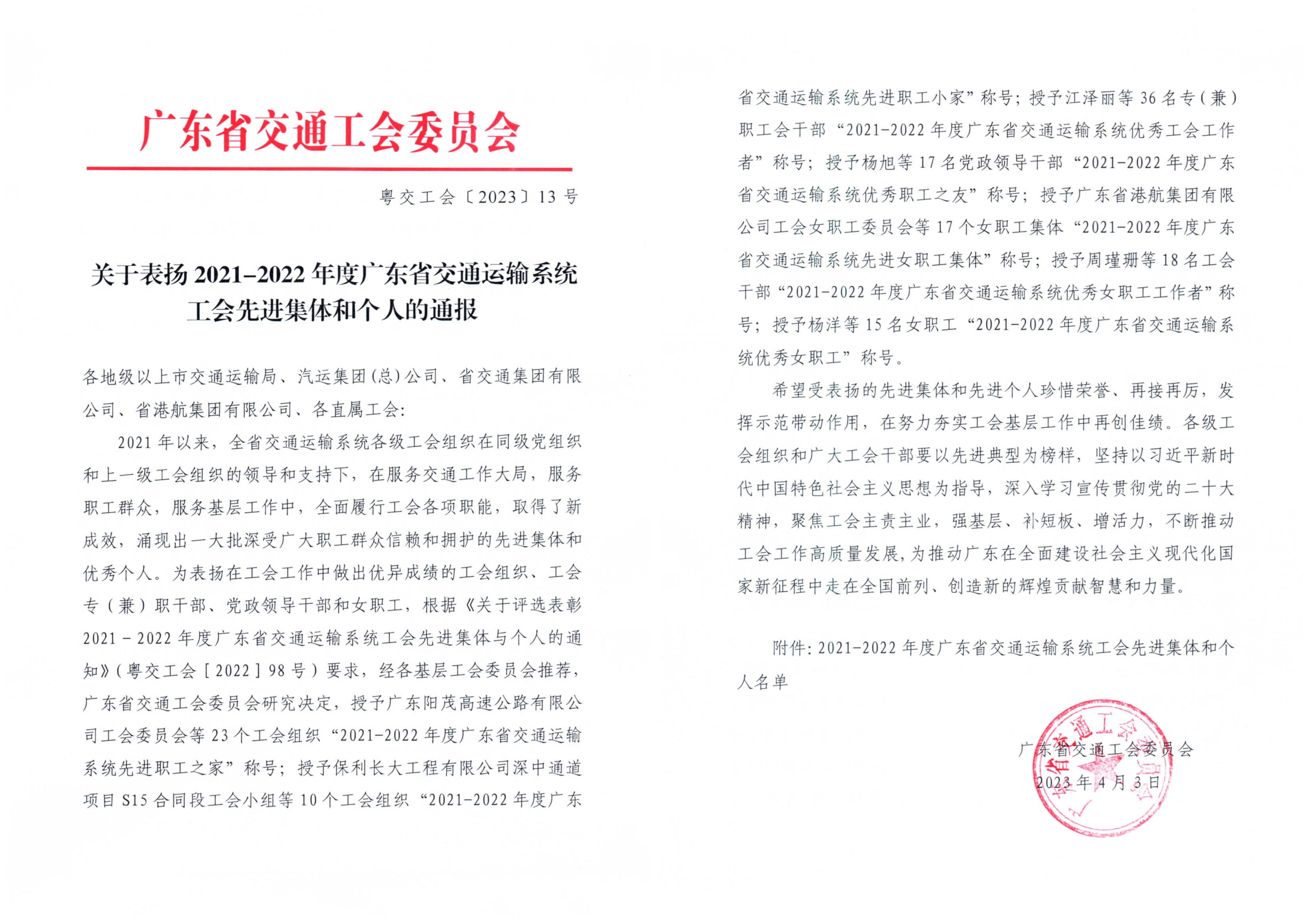 近日,集團工會被廣東省交通工會委員會授予2021-2022年度廣東省交通運輸系統“先進職工之家”榮譽稱號;集團總經理黃湛軍獲評為“優秀職工之友”,綜合管理辦公室黃瑞怡獲評為“優秀工會工作者”。特此報喜!