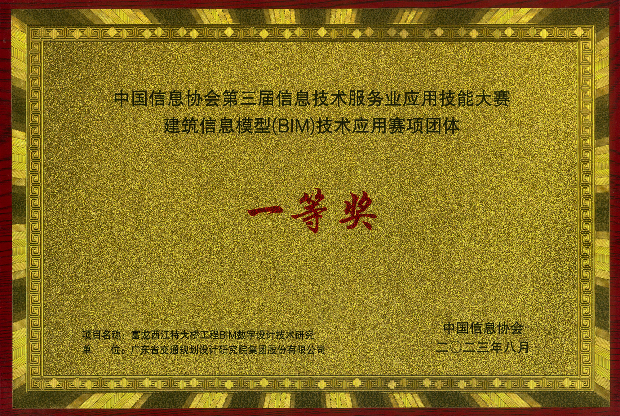 近日,2023年度中國信息協會第三屆信息技術服務業應用技能大賽頒獎典禮在北京隆重召開。經過選拔賽、決賽和專家審議復查,公司《富龍西江特大橋工程BIM數字設計技術研究》項目從全國各工程行業1200余個BIM參評項目的激烈競爭中脫穎而出,榮獲一等獎。這是公司首次獲得中國信息協會BIM賽項一等獎。