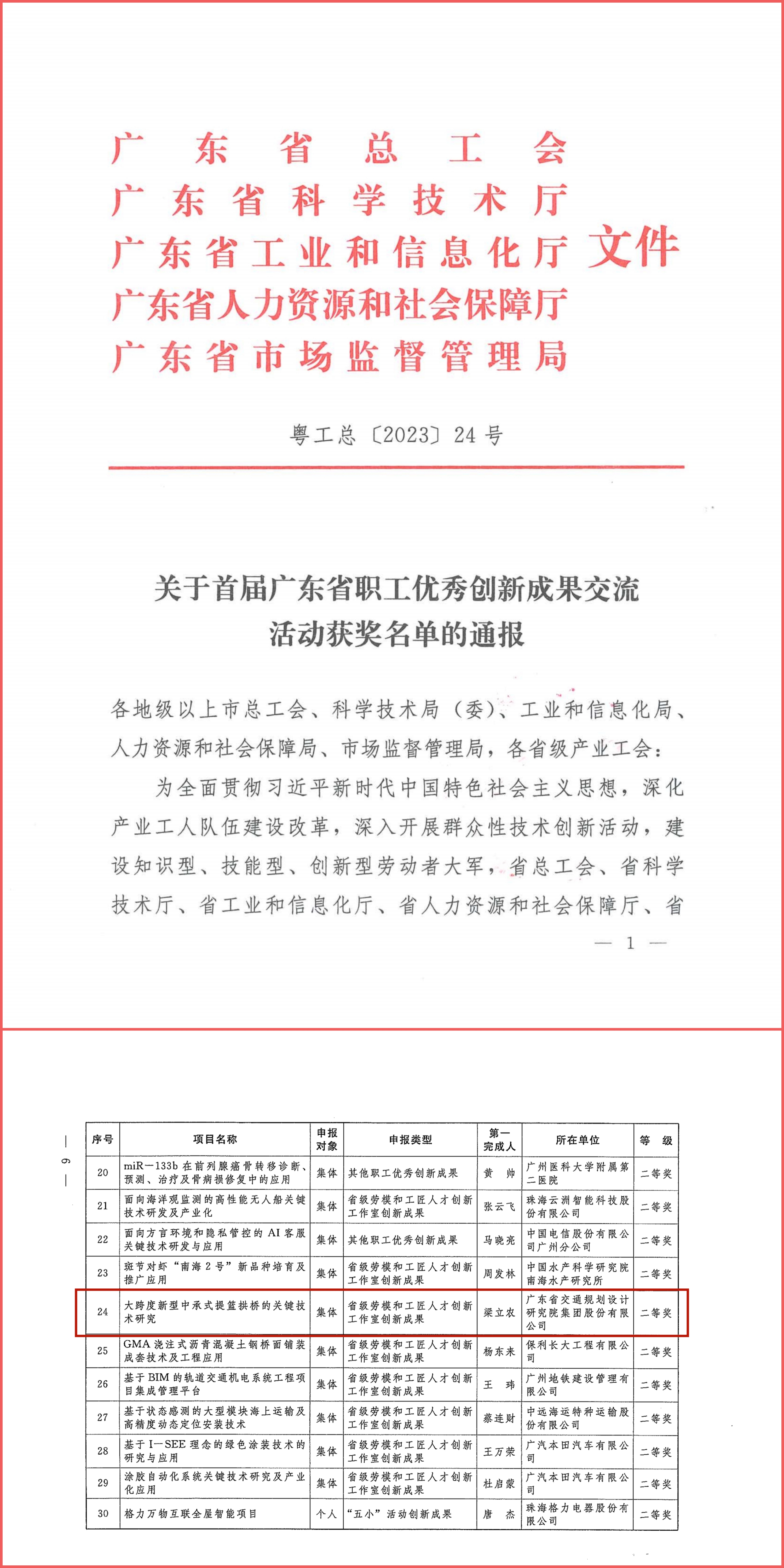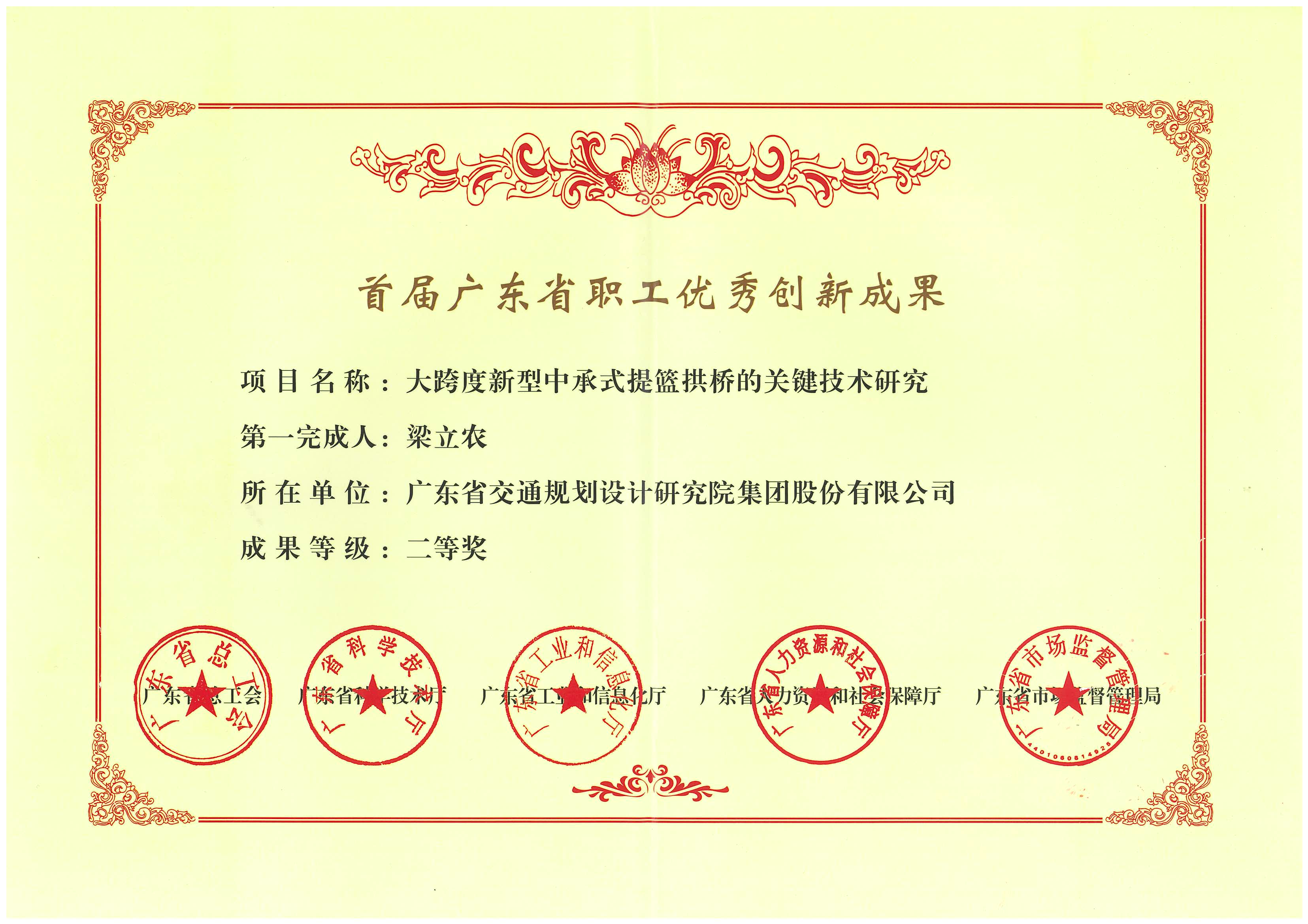 近日,公司梁立農創新工作室《大跨度新型中承式提籃拱橋的關鍵技術研究》項目獲廣東省職工優秀創新成果二等獎。