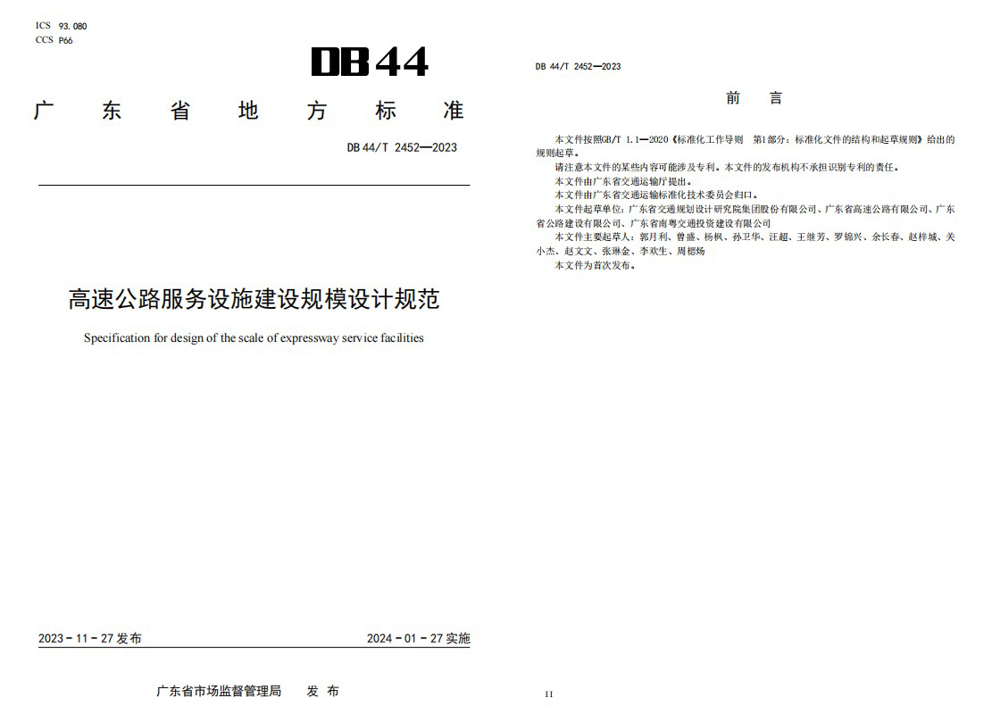 11月27日,由公司主編的廣東省地方標準《高速公路服務設施建設規模設計規范》(DB44/T 2452-2023)經廣東省市場監督管理局批準正式發布,實施日期為2024年1月27日。