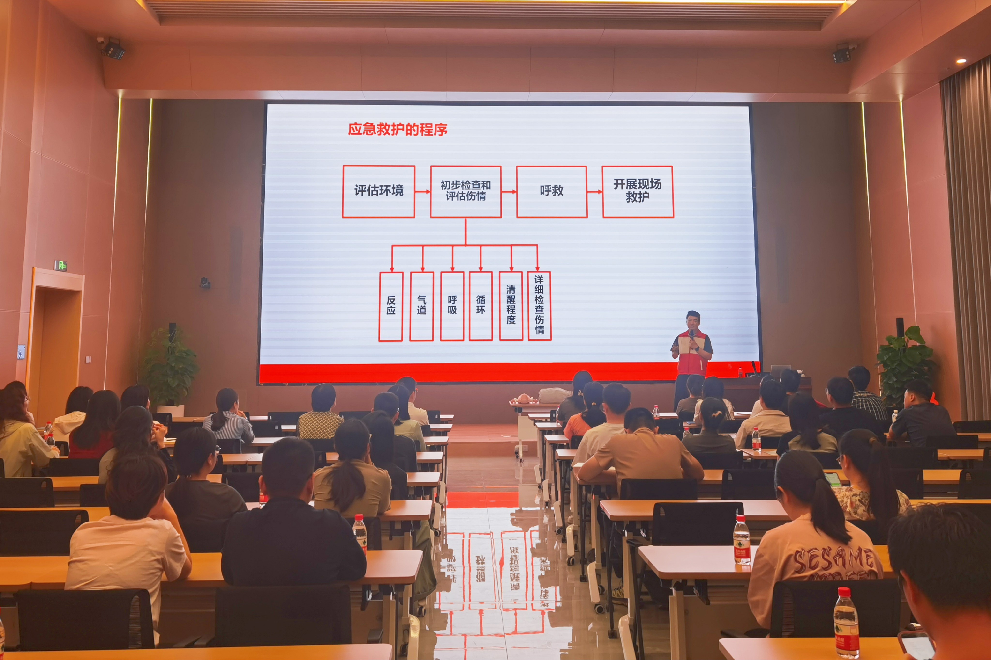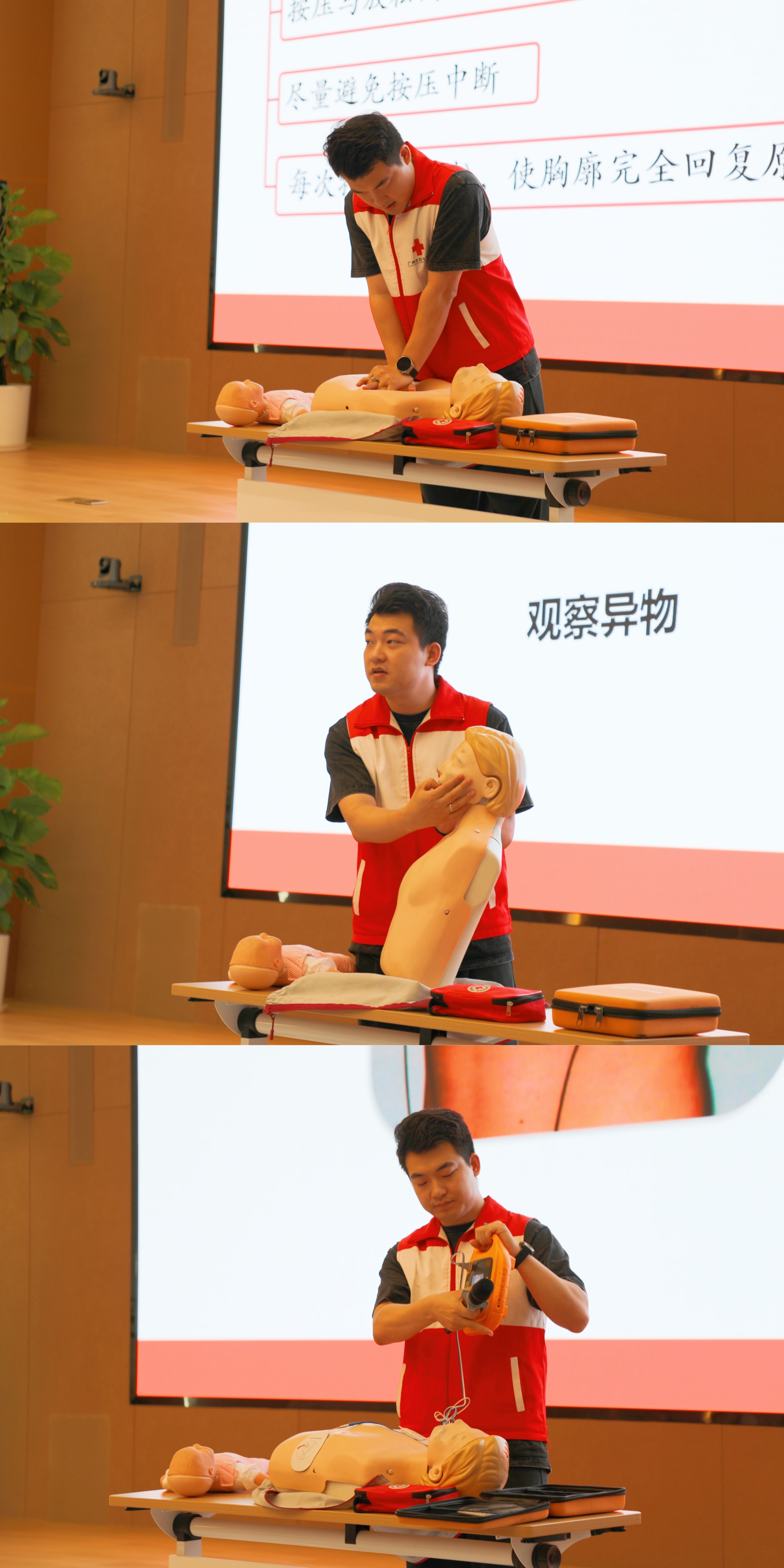 培訓現場,市紅十字會應急救護講師結合救護案例,指出了常見的急救誤區,提供了正確的急救觀念及講解了心肺復蘇術、AED的操作使用、氣道異物梗阻的處理、外出血的止血與包扎等應急救護知識,同時,模擬演示了各項應急救護的操作細節。