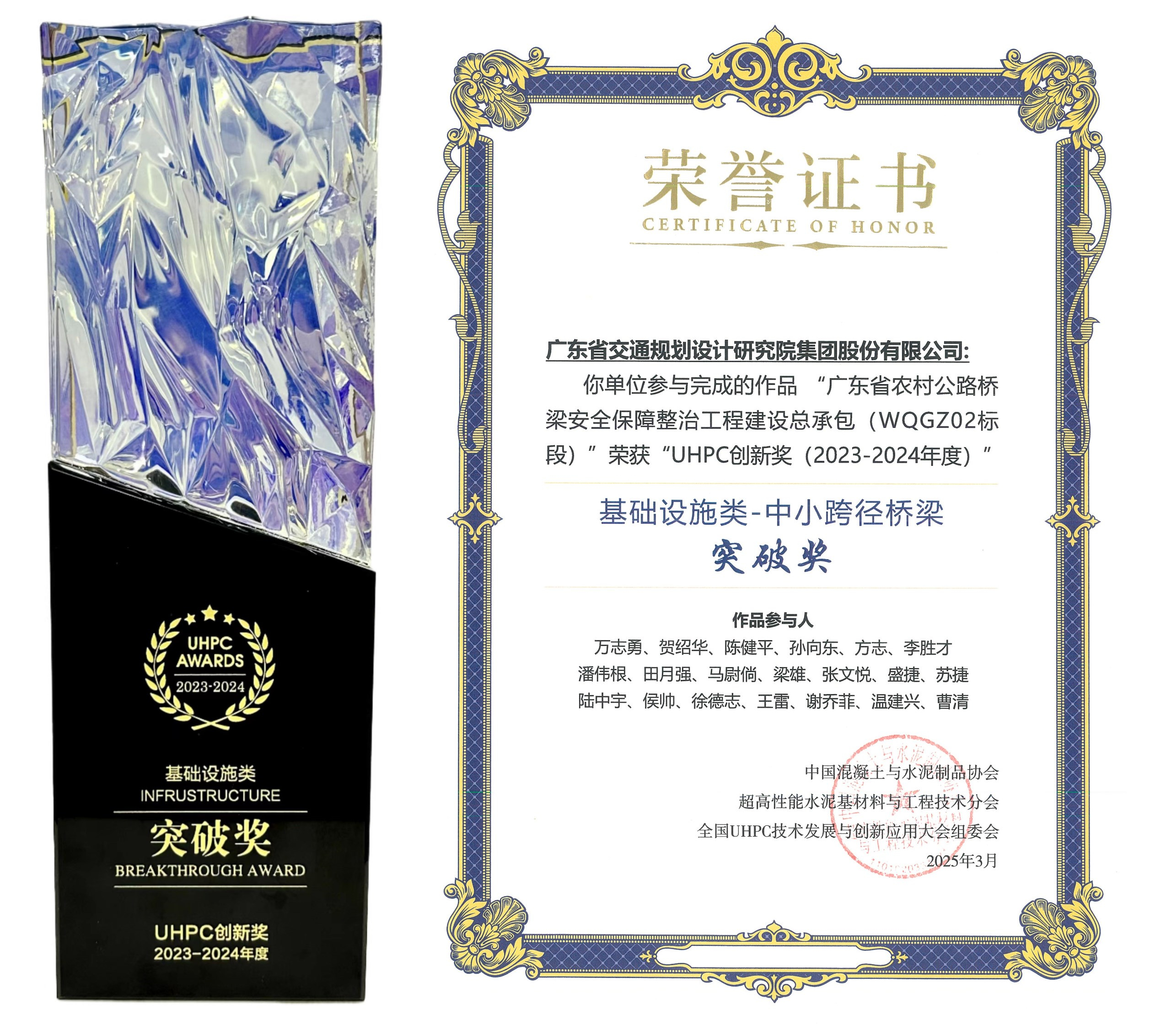 近日,中國混凝土與水泥制品協(xié)會超高性能水泥基材料與工程技術分會(簡稱CCPA-UHPC分會)主辦的第二屆全國UHPC技術發(fā)展和創(chuàng)新應用大會在武漢隆重召開。公司承擔的“廣東省農村公路橋梁安全保障整治工程建設總承包(WQGZ02標段)”項目榮獲大會頒發(fā)的“UHPC創(chuàng)新獎(2023-2024年度)基礎設施類突破獎”。公司總工程師孫向東、副總工程師萬志勇,養(yǎng)護設計院總工程師武建中、副總工程師李勝才等參加了會議及頒獎典禮。