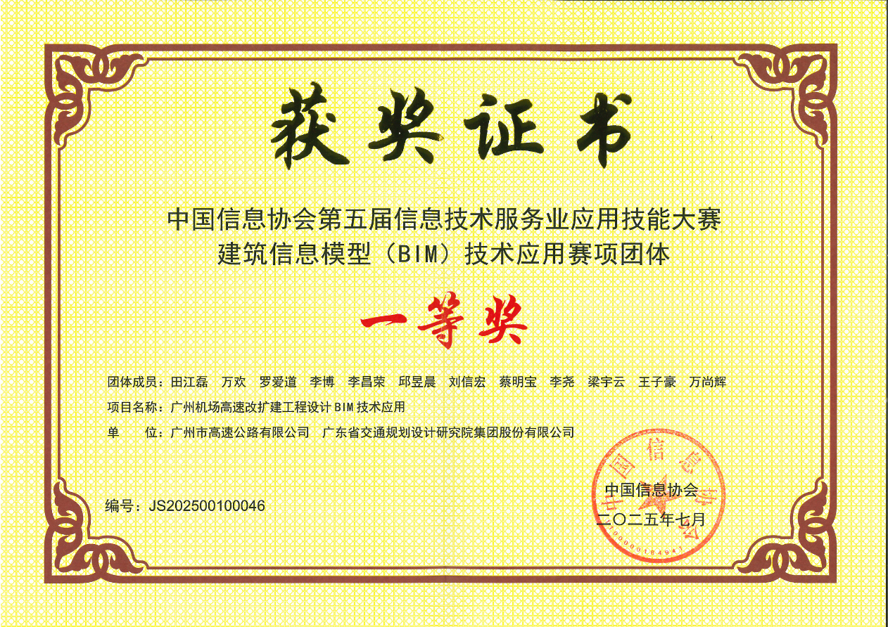 7月21日,2025年度中國信息協會第五屆信息技術服務業應用技能大賽頒獎典禮在北京隆重召開。經過選拔賽、決賽和專家審議復查,公司《廣州機場高速改擴建工程設計BIM技術應用》項目從全國各工程行業900余個BIM參評項目的激烈競爭中脫穎而出,榮獲一等獎。