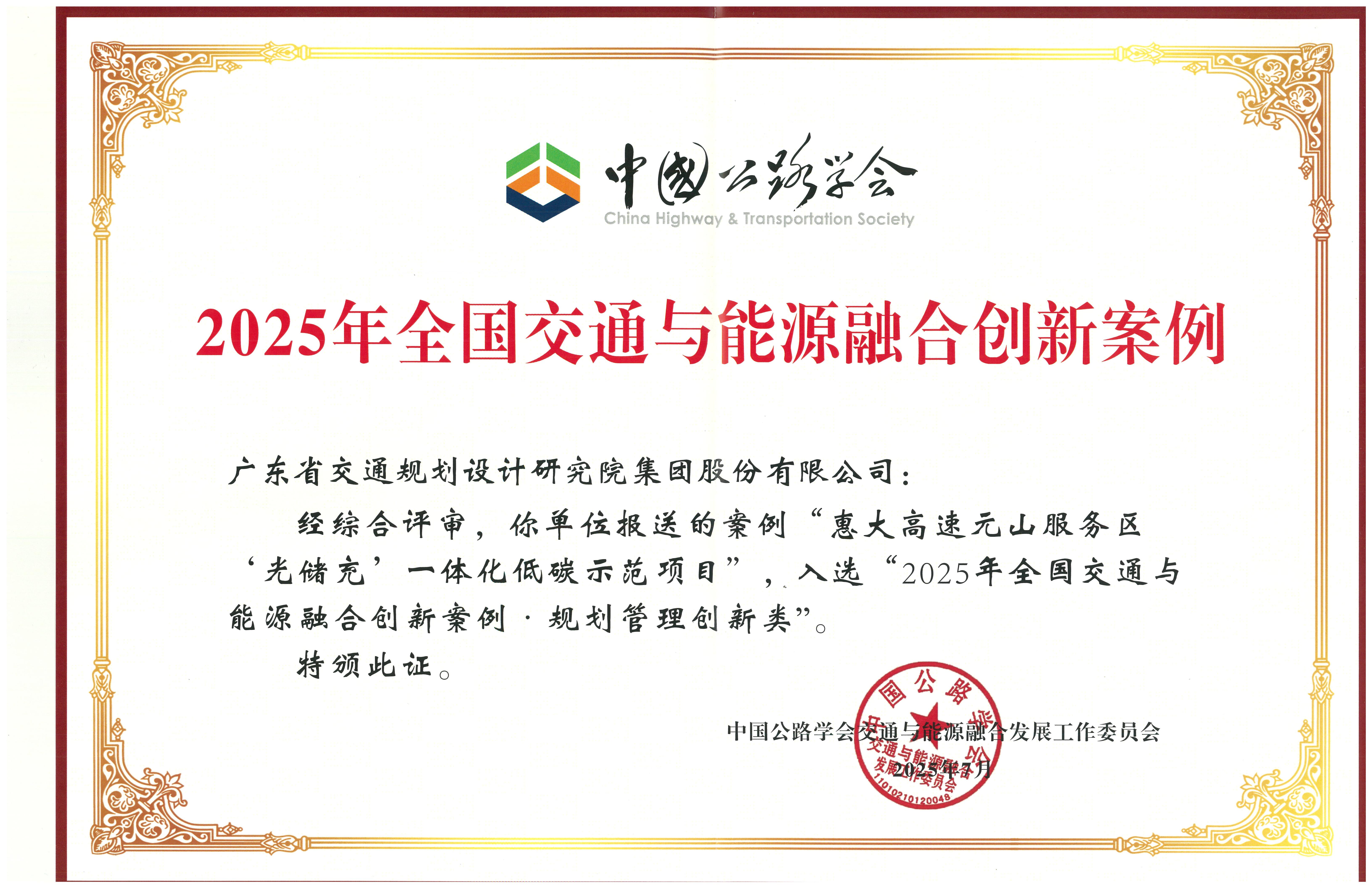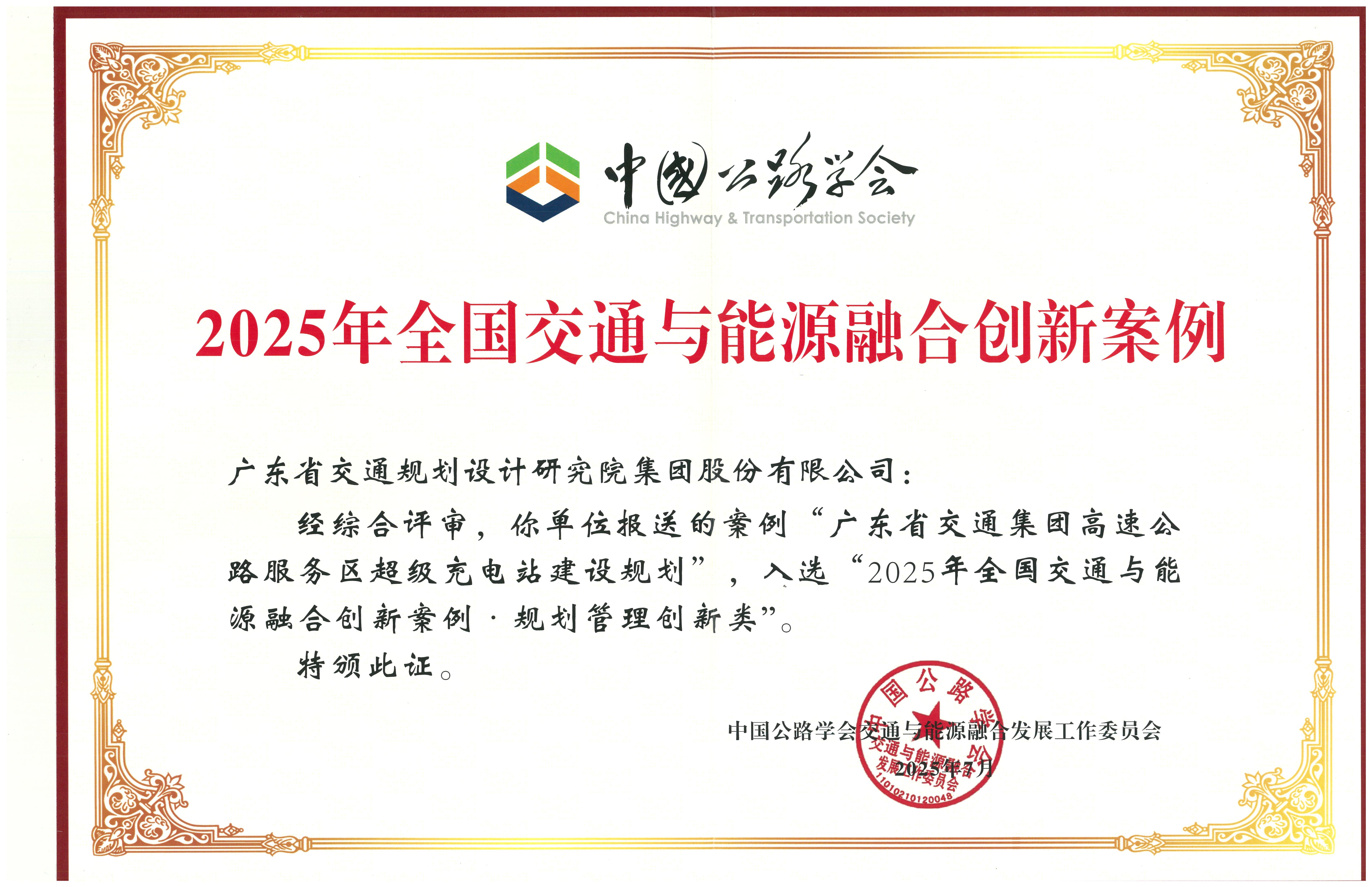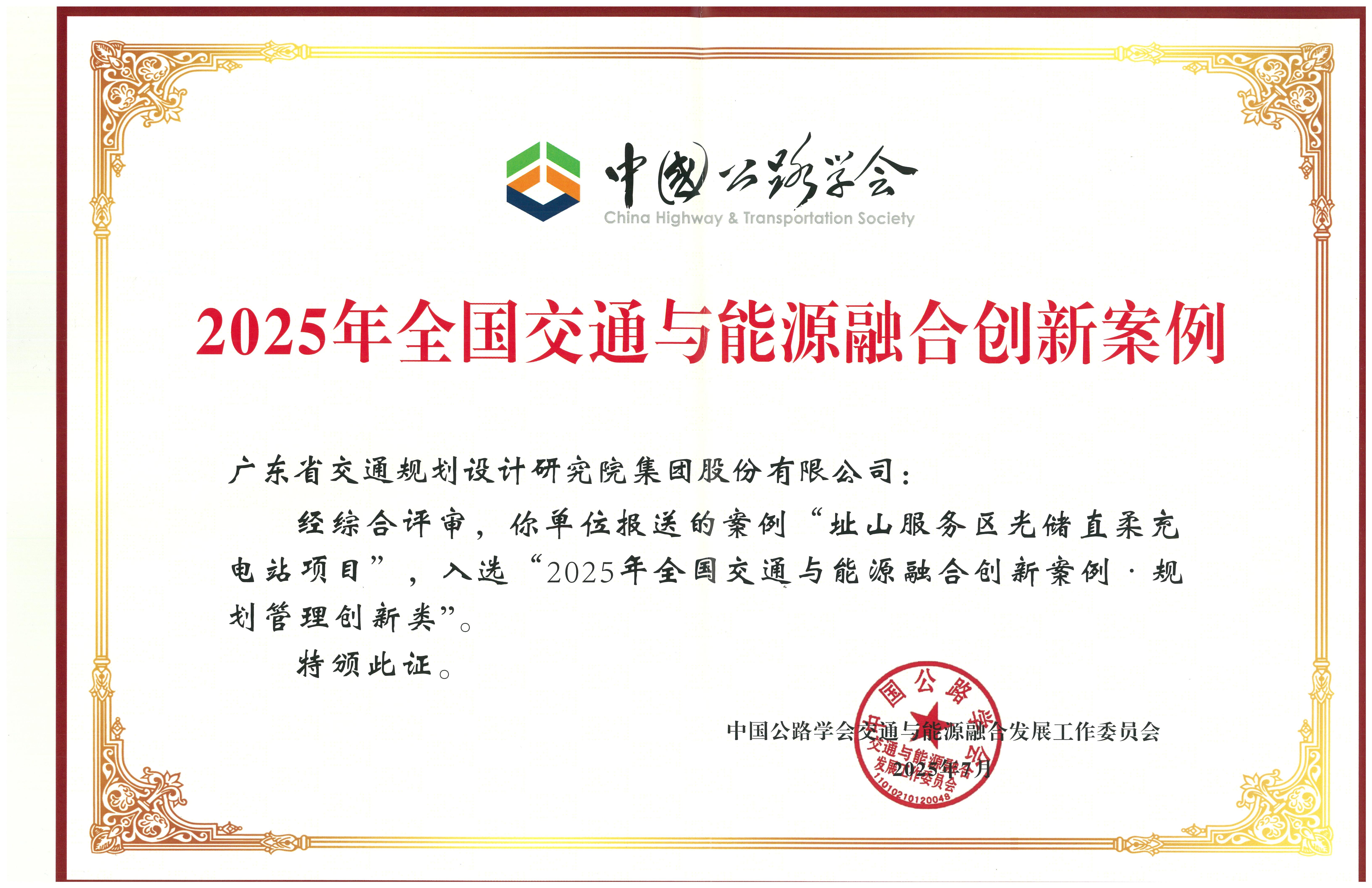 本屆年會(huì)以“綠色引擎 數(shù)智驅(qū)動(dòng)”為主題,共同擘畫交通與能源深度融合發(fā)展的新藍(lán)圖,集中展示我國交能融合領(lǐng)域最前沿的研究成果、實(shí)踐標(biāo)桿與權(quán)威洞見。會(huì)議期間,組委會(huì)正式發(fā)布了“2025年全國交通與能源融合創(chuàng)新案例集”,此次全國共有64項(xiàng)優(yōu)秀項(xiàng)目入選,其中公司《廣東省交通集團(tuán)高速公路服務(wù)區(qū)超級(jí)充電站建設(shè)規(guī)劃》《惠大高速元山服務(wù)區(qū)“光儲(chǔ)充”一體化低碳示范項(xiàng)目》《址山服務(wù)區(qū)光儲(chǔ)直柔充電站項(xiàng)目》三個(gè)項(xiàng)目入選。