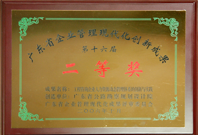 經廣東省企業管理現代化成果評審委員會審定,由我院完成的《工程咨詢企業人力資源動態管理體系的創新與實踐》榮獲第十六屆廣東省企業管理現代化創新成果二等獎(粵管審[2006]6號文),特此報喜。