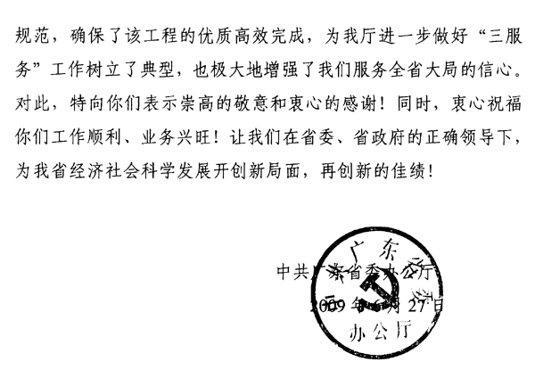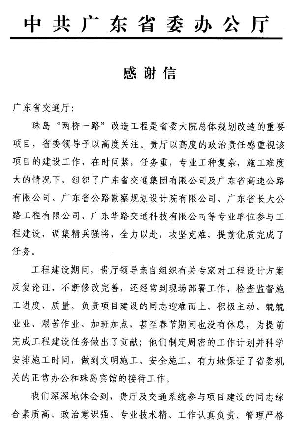 省委關(guān)于珠島“兩橋一路”改造工程的《感謝信》