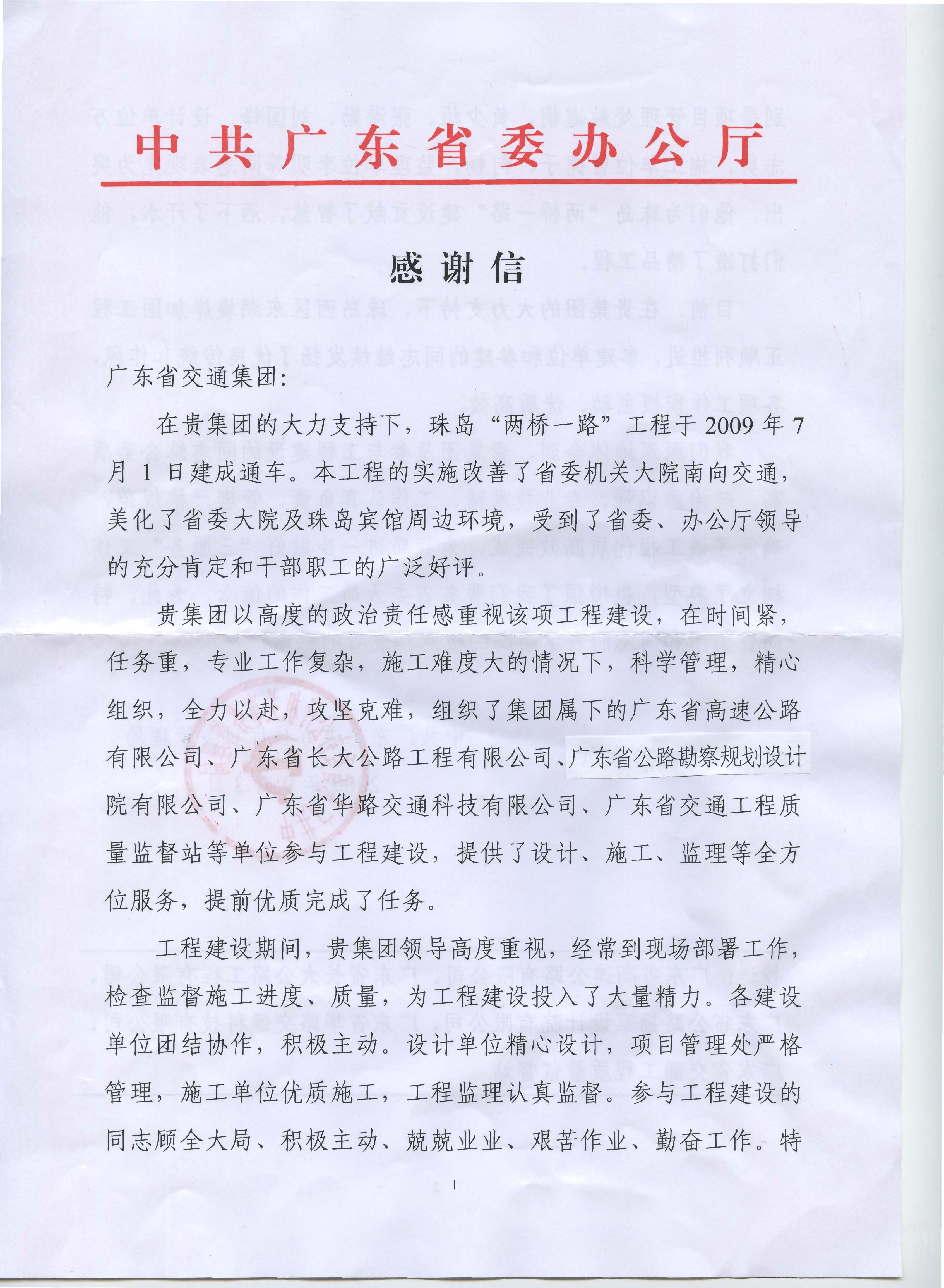 省委辦公廳機關管理局關于珠島“兩橋一路”工程的感謝信