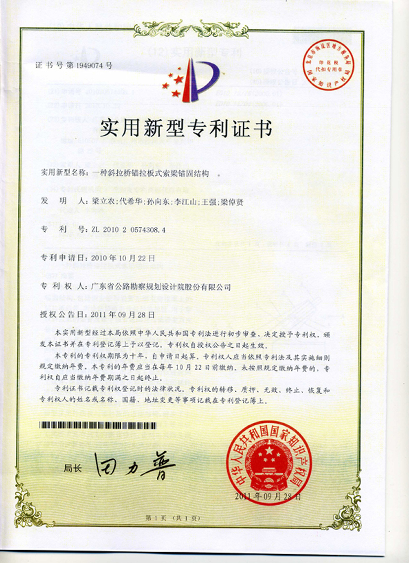 熱烈祝賀: 公司研發(fā)的“一種斜拉橋錨拉板式索梁錨固結(jié)構(gòu)”技術(shù),于2011年9月28日被中華人民共和國國家知識產(chǎn)權(quán)局授予實(shí)用新型專利權(quán)。