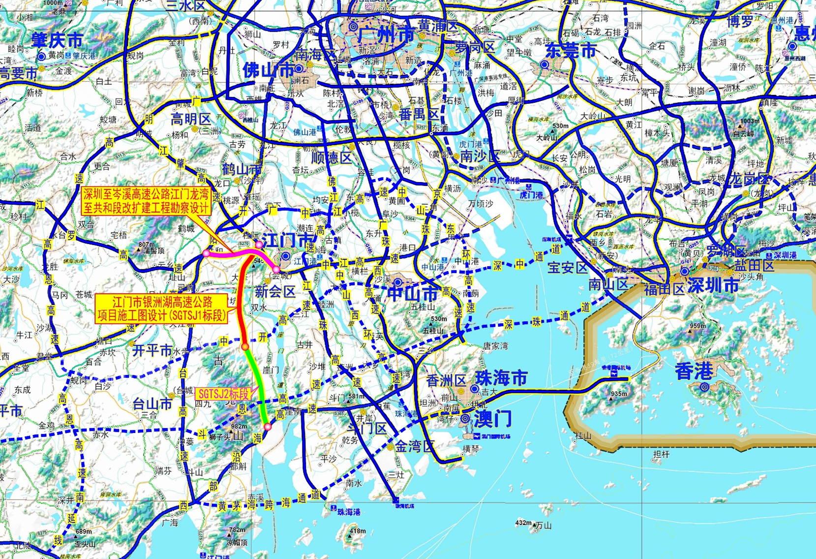 江門市銀洲湖高速公路項目路線起于蓬江區(qū)棠下鎮(zhèn),接珠三角環(huán)線高速公路,終點位于新會區(qū)崖門鎮(zhèn)(接西部沿海高速公路),長約53.8km,采用雙向六車道高速公路標準,設(shè)計速度120km/h,路基寬度34.5m。我司承擔的是銀洲湖高速SGTSJ1標段(總體標)的土建勘察設(shè)計和總體協(xié)調(diào)任務(wù)。該標段全長約31.3km,總投資約82億元。